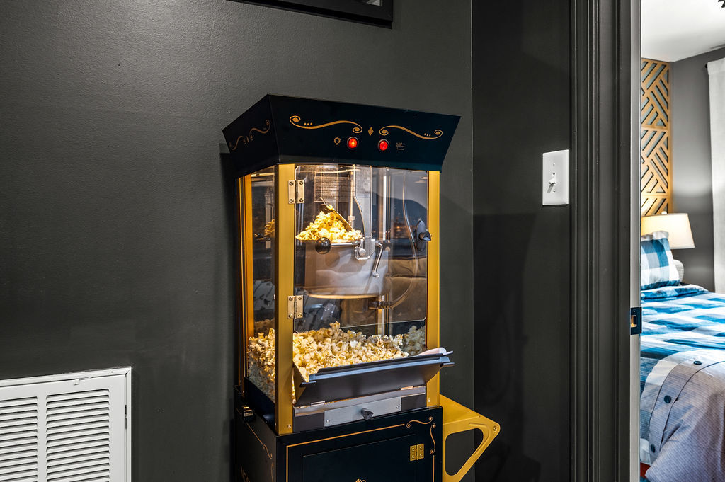 If outdoor dining is more your style, step outside to the covered patio, where you’ll find a 6 burner propane grill. Guests can lounge on the comfortable oversized couch in front of the outdoor fireplace with a 65-inch TV overhead, relax in the twin-XL daybed swing, or take a dip in the 6-person hot tub while taking in the treetop views.